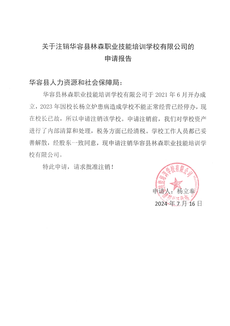 关于注销华容县林森职业技能培训学校有限公司的申请报告