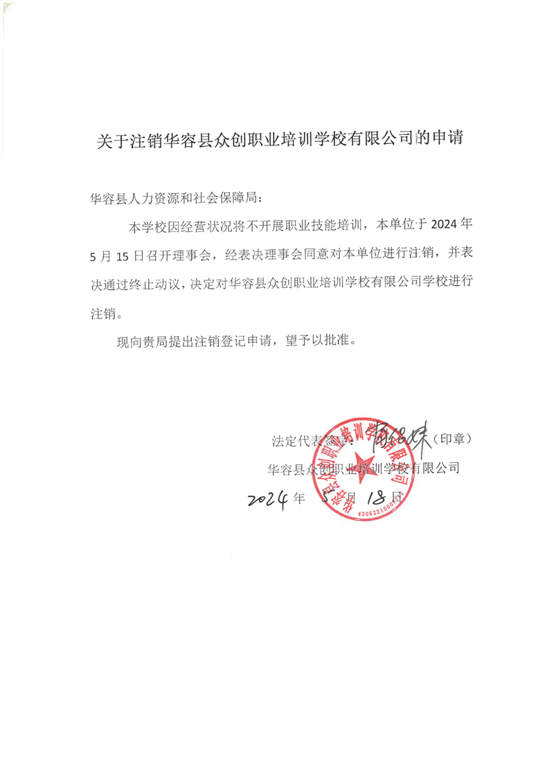 关于注销华容县众创职业培训学校有限公司的申请