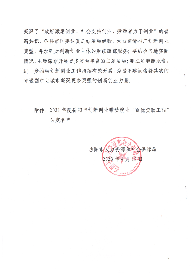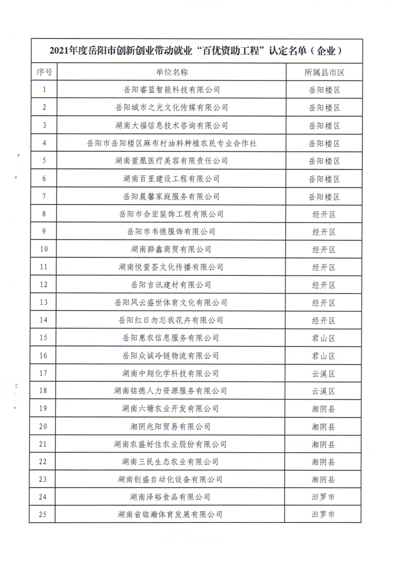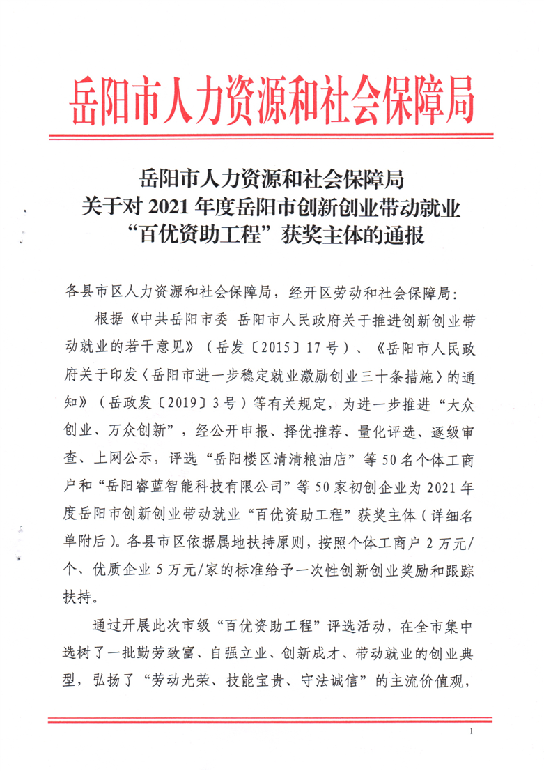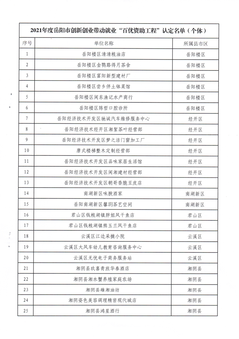 关于对2021年度岳阳市创新创业带动就业“百优资助工程”获奖主体的通报
