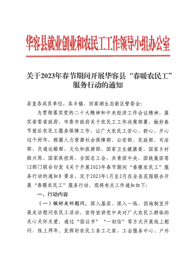 关于2023年春节期间开展华容县“春暖农民工”服务行动的通知