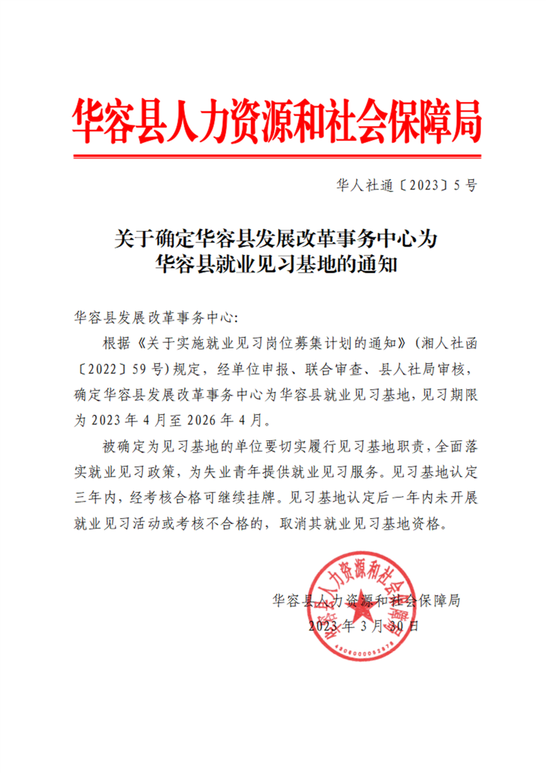 关于确定华容县发展改革事务中心为华容县就业见习基地的通知