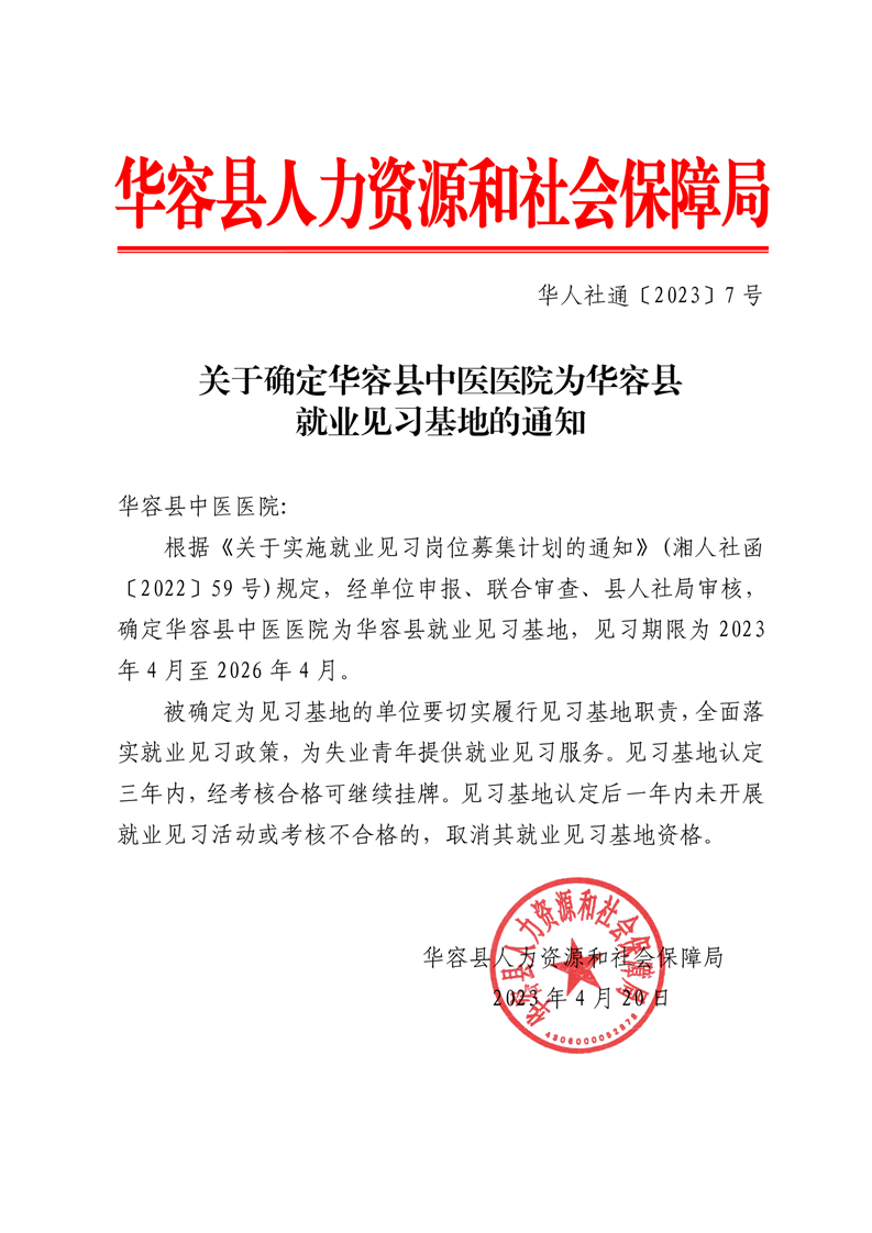 关于确定华容县中医医院为华容县就业见习基地的通知