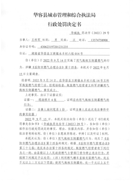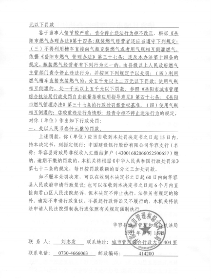 华容县万瘐镇永丰村六组燃气经营者用气瓶相互倒灌燃气的行政处罚决定公示