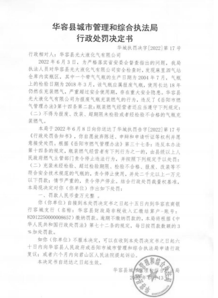 华容县光大液化气有限公司麻里泗气站使用报废气瓶的行政处罚决定公示