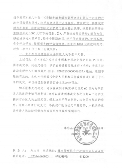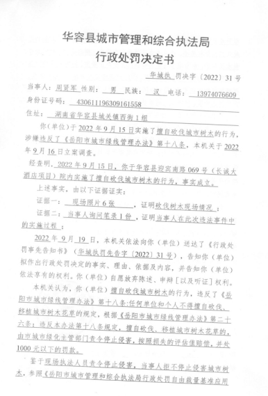 华容县城关镇西街擅自砍伐树木的行政处罚决定公示