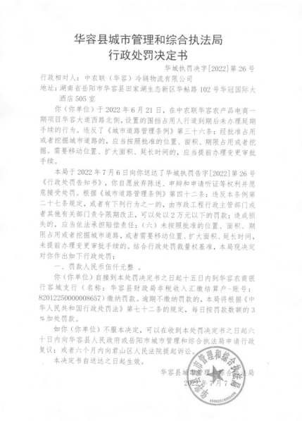 中农联华容农产品电商一期项目设置围挡占用人行道到期后未办理延期手续的行政处罚决定公示
