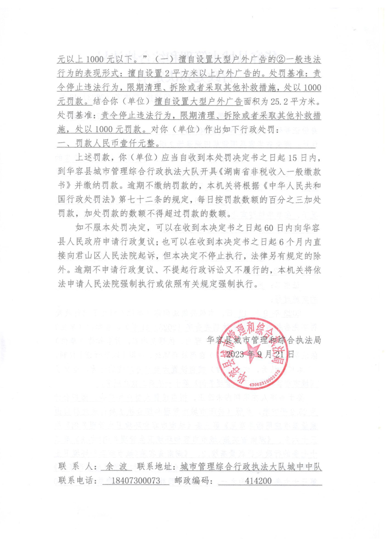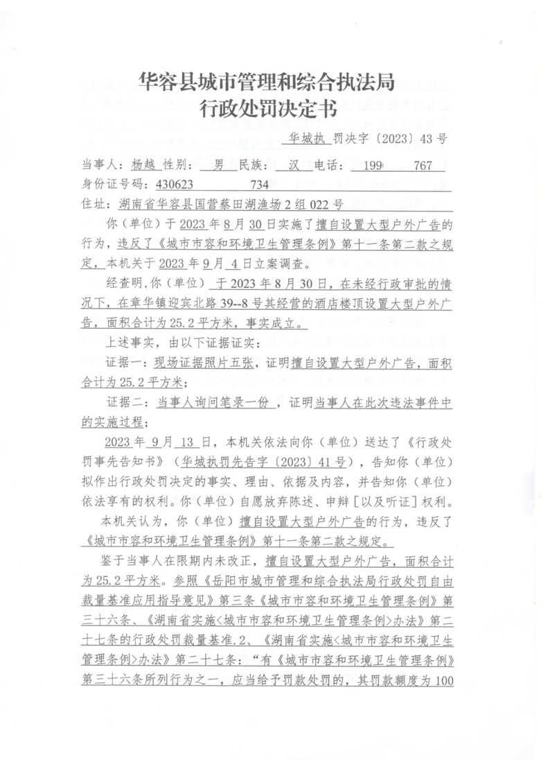 (华城执罚决字[2023]43号)对杨某违反城市市容和环境卫生管理条例的行政处罚决定公示