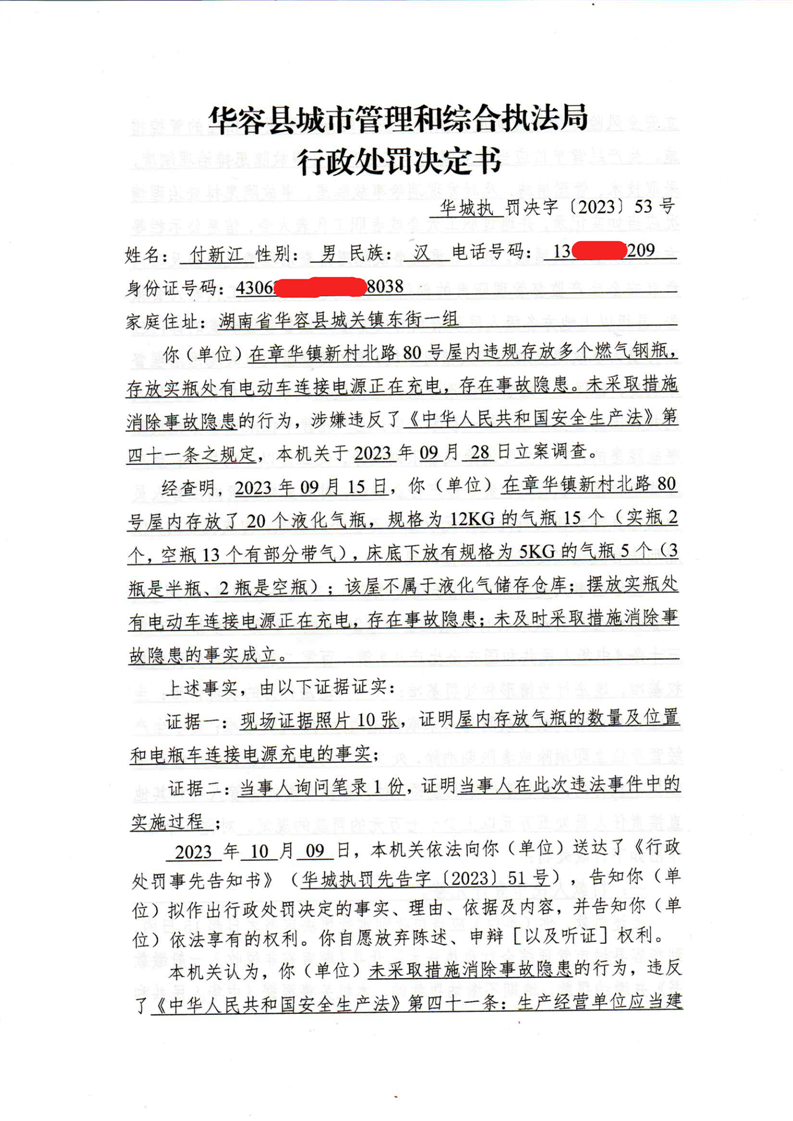 (华城执罚决字[2023]53号)对付某违反安全生产法的行政处罚决定公示