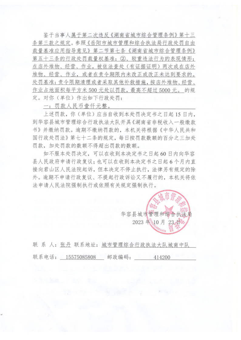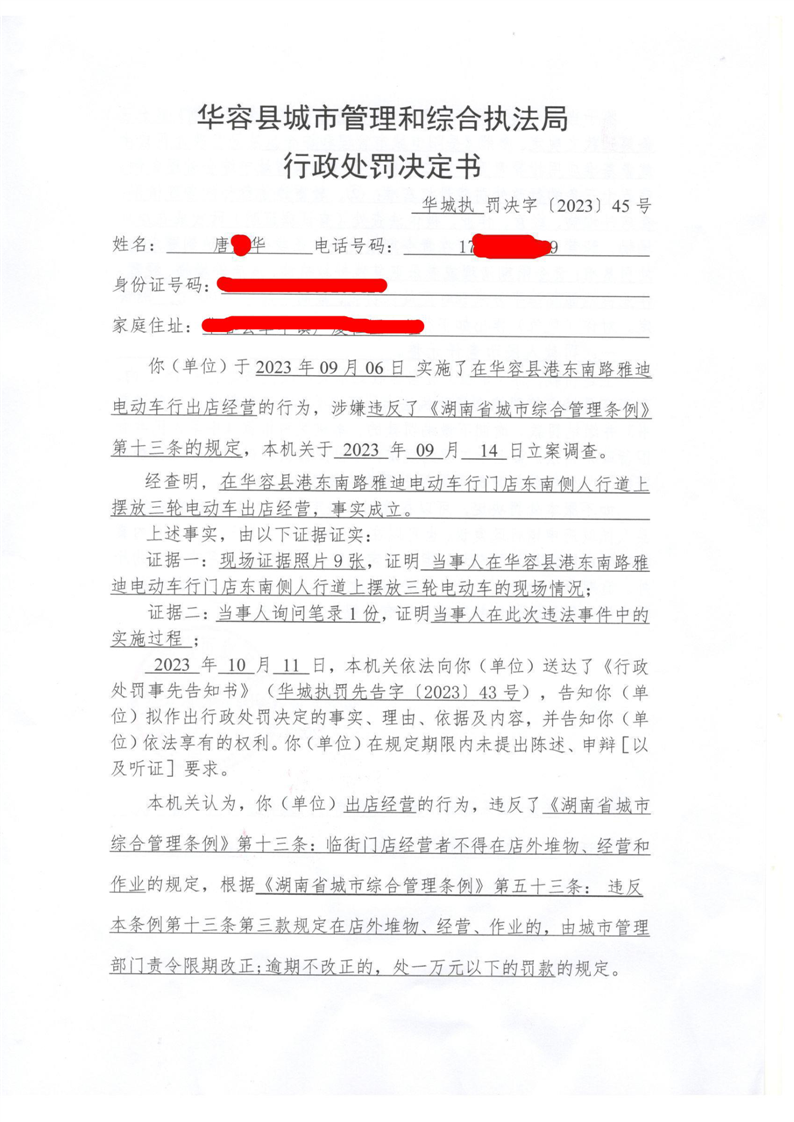 (华城执罚决字[2023]45号)对唐某违反湖南省城市综合管理条例的行政处罚决定公示