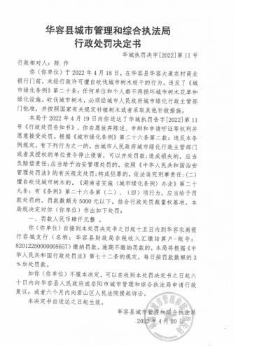 华容县华容大道农村商业银行门前,未经行政许可擅自砍伐城市树木枝干的行政处罚决定公示