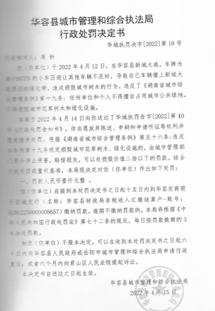 华容县新城大道,驾车撞上新城磊道绿化带,造成损毁城市树木的行政处罚决定公示