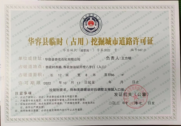 华容县临时(占用)挖掘城市道路许可证杏花石化有限公司(八字口)入口