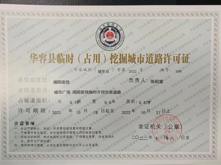 华容县临时(占用)挖掘城市道路许可证城市广场湘阴面馆
