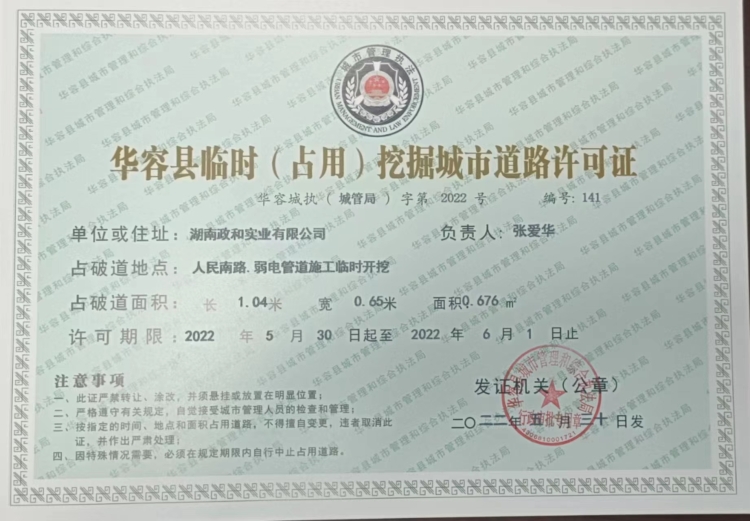 华容县临时(占用)挖掘城市道路许可证湖南政和实业有限公司