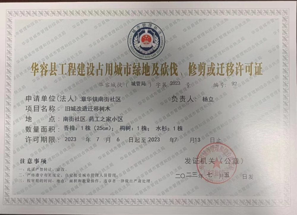 华容县章华镇南街社区旧城改造迁移树木许可公示