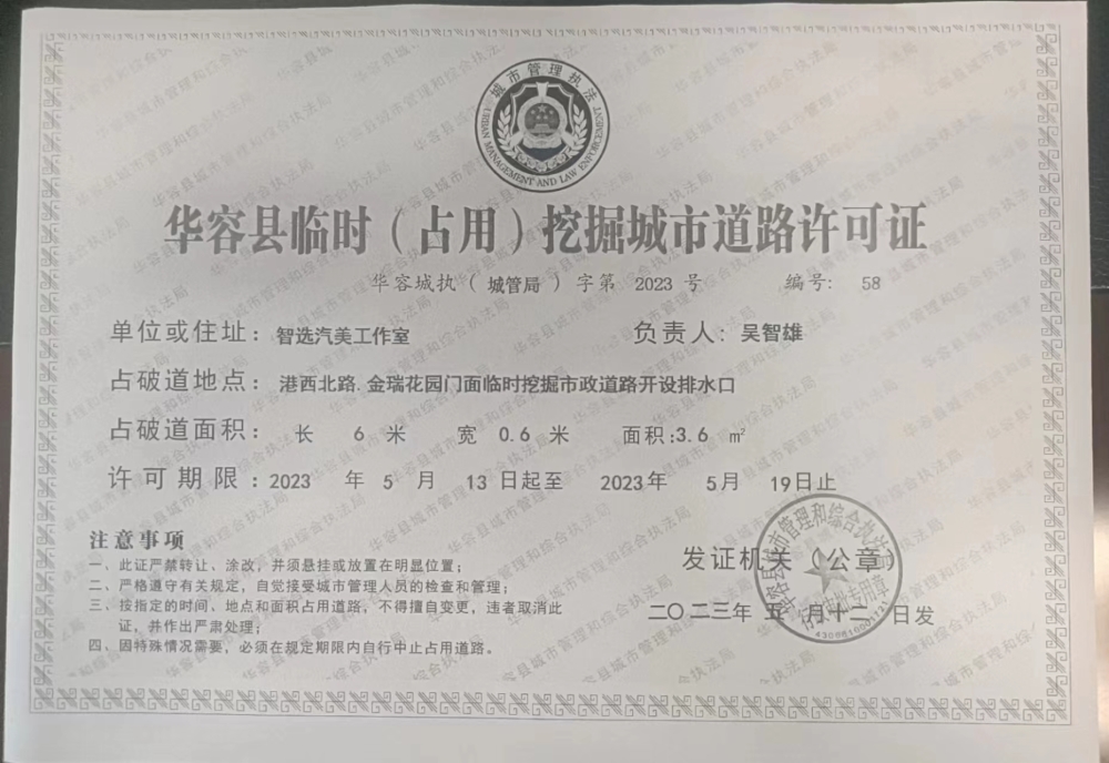 华容县智选汽美临时(占用)挖掘城市道路许可公示