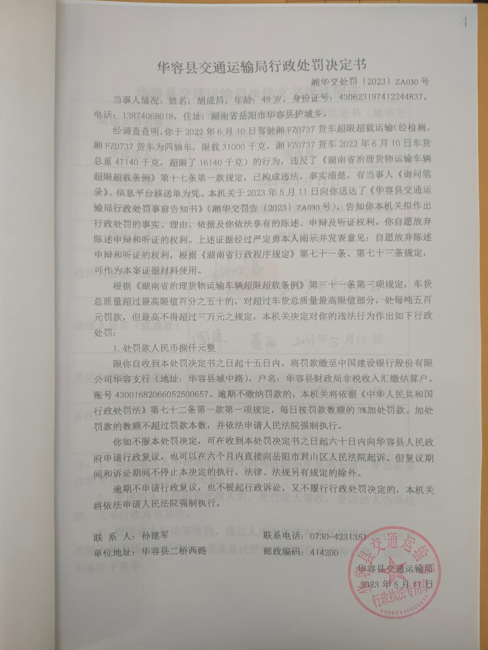 胡成昌驾驶货车超限超载运输的行政处罚公示(湘华交处罚[2023]ZA030号)