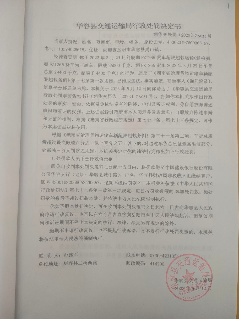 范新甫驾驶货车超限超载运输的行政处罚公示(湘华交处罚[2023]ZA031号)