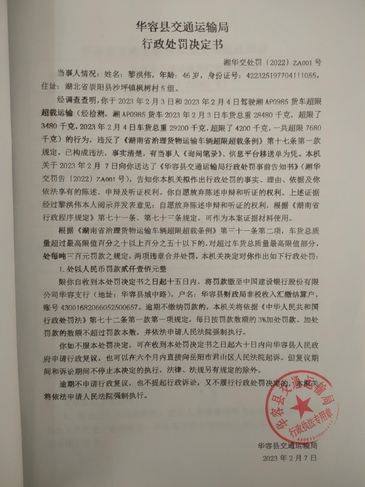 黎洪伟驾驶货车超限超载运输的行政处罚公示(湘华交处罚[2023]ZA001号)