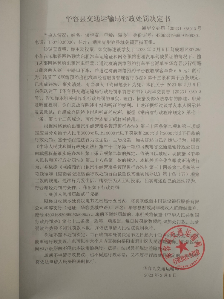 谈学友主动投案在未取得网络预约出租汽车运输证擅自从事经营的行政处罚公示(湘华交处罚[2023]KBA013号)
