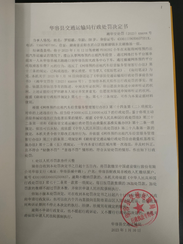 罗绍雌未取得网约车运输证擅自从事经营的行政处罚公示(湘华交处罚[2023]KBA008号)