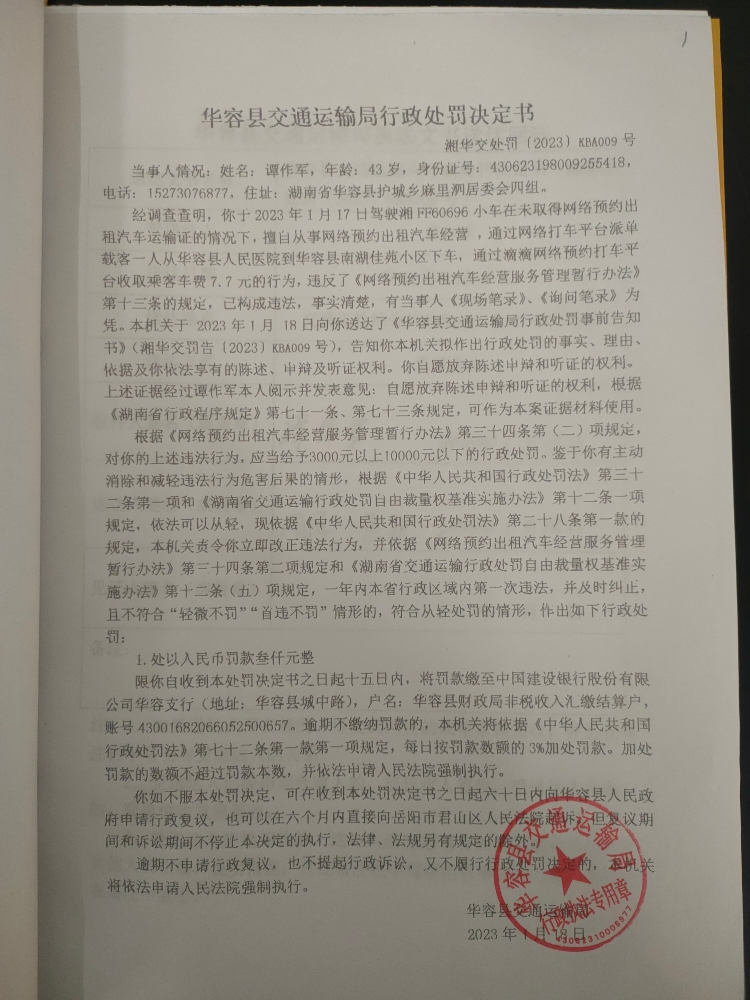 谭作军未取得网约车运输证擅自从事经营的行政处罚公示(湘华交处罚[2023]KBA009号)
