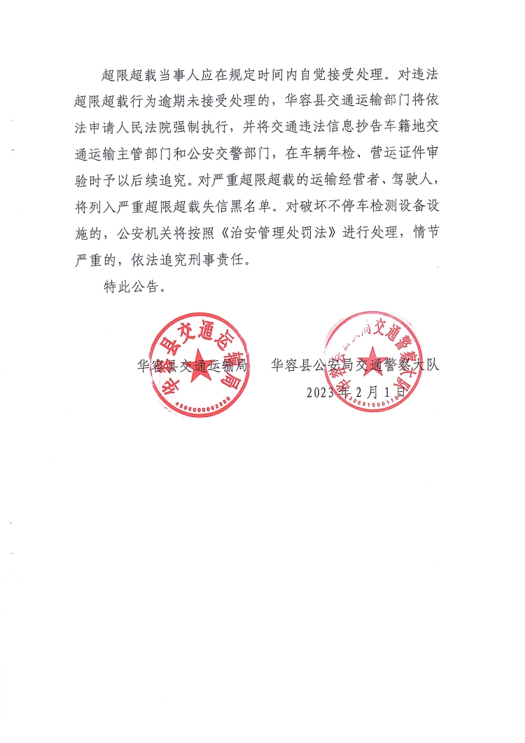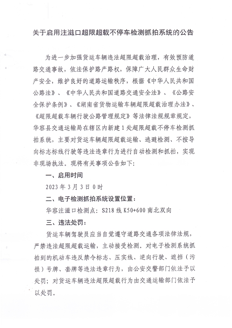 关于启用注滋口超限超载不停车检测抓拍系统的公告