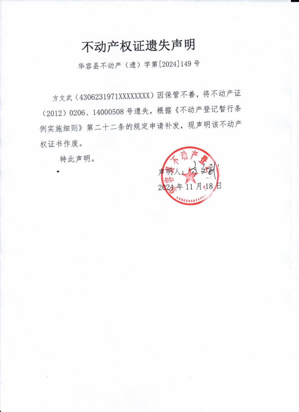 不动产权证遗失声明(方文武)