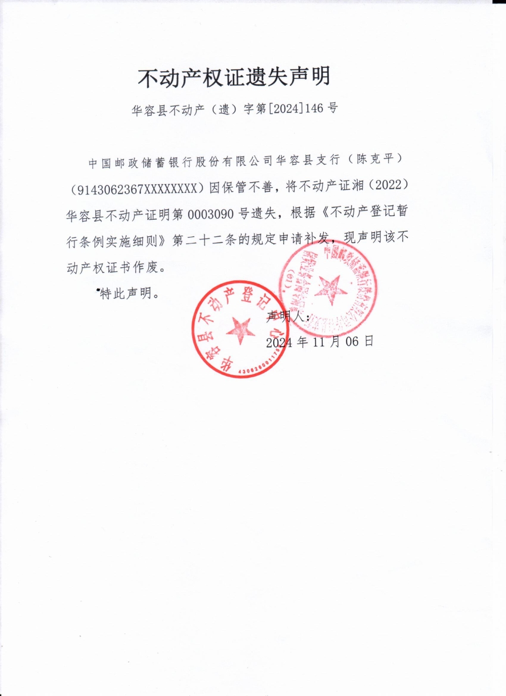 不动产权证遗失声明(中国邮政储蓄银行股份有限公司华容县支行、陈克平)