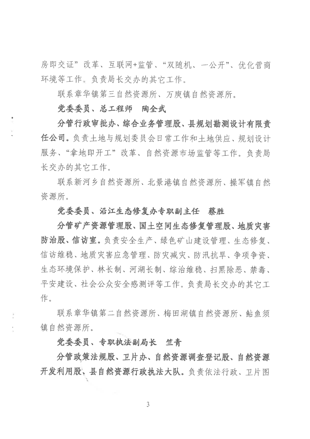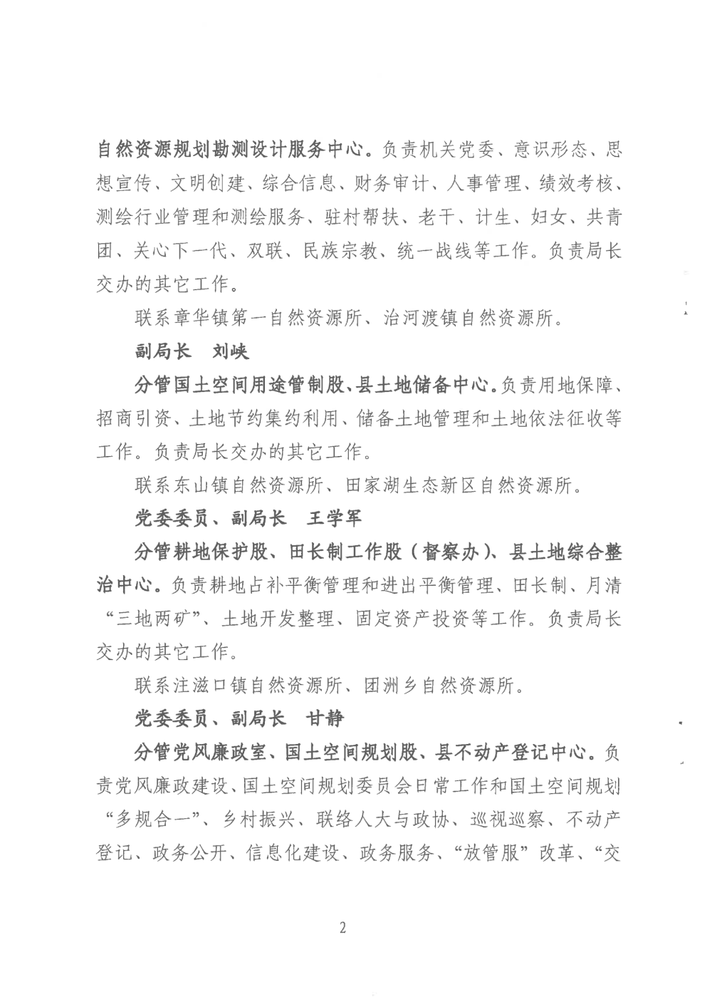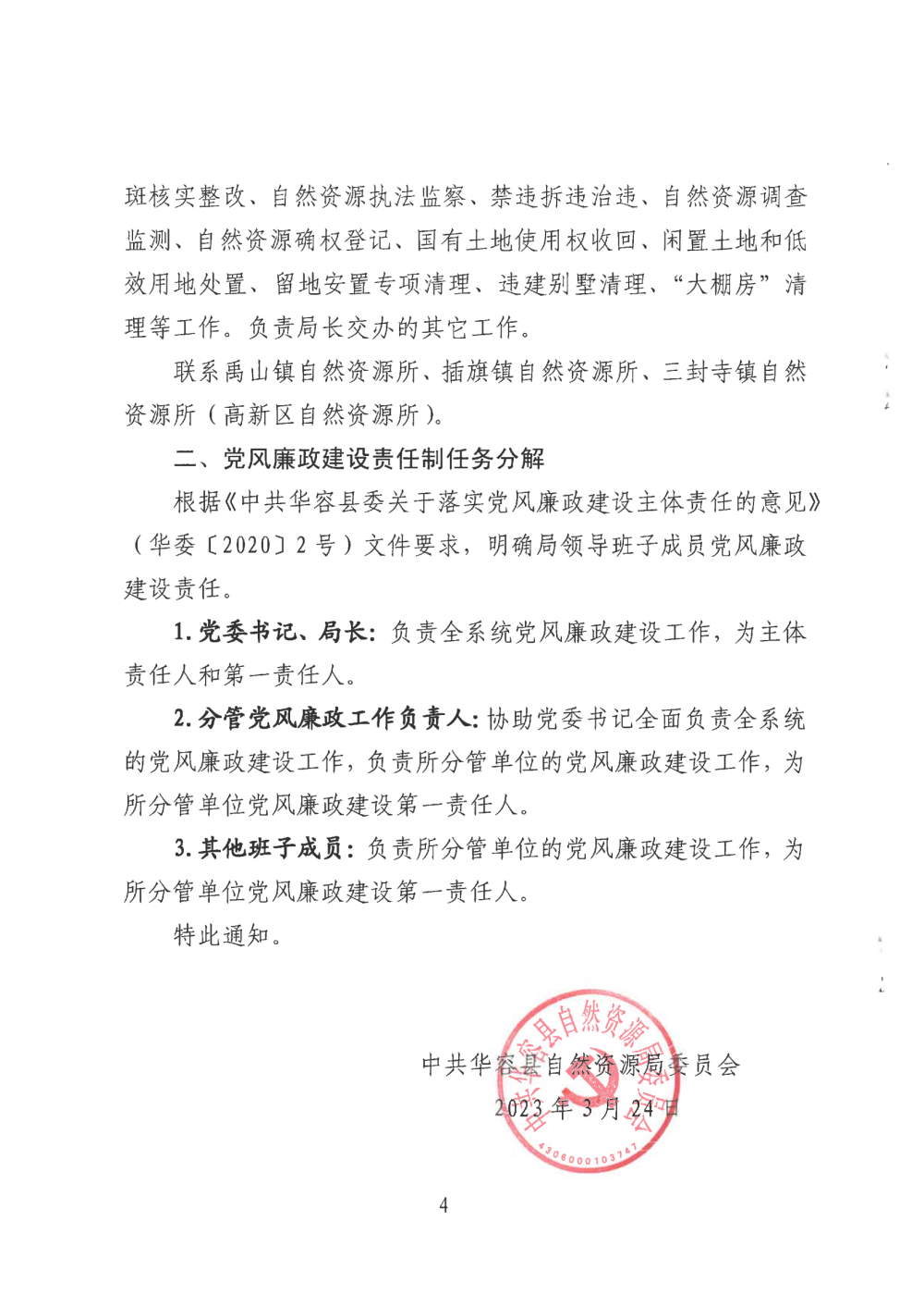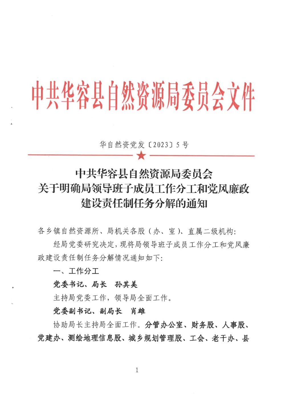 中共华容县自然资源局委员会关于明确局领导班子成员工作分工和党风廉政建设责任制任务分解的通知