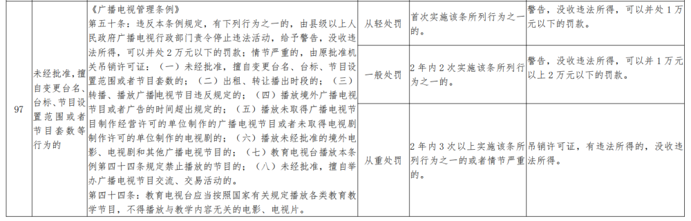 | 一级事项 | 行政处罚 | 二级事项 | 对擅自变更台名、台标、节目设置范围或者节目套数的处罚 |
