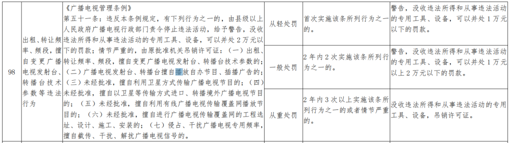| 一级事项 | 行政处罚 | 二级事项 | 对出租、转让频率、频段,擅自变更广播电视发射台、转播台技术参数的处罚 |