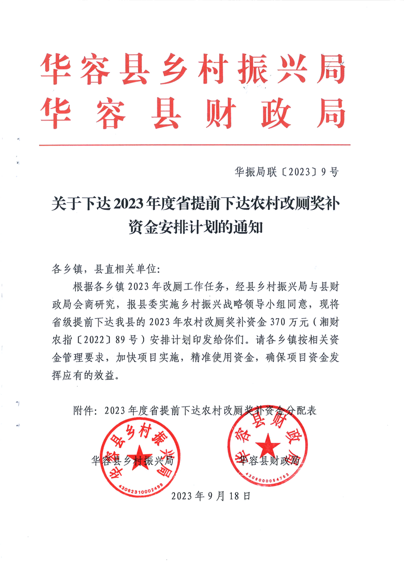 华振局联〔2023〕9号-关于下达2023年省级第一批农村改厕奖补资金安排计划的通知