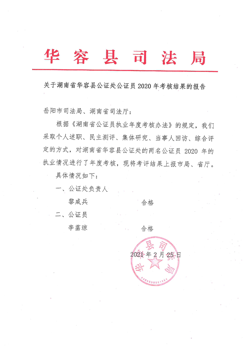 关于湖南省华容县公证处公证员2020年考核结果的报告