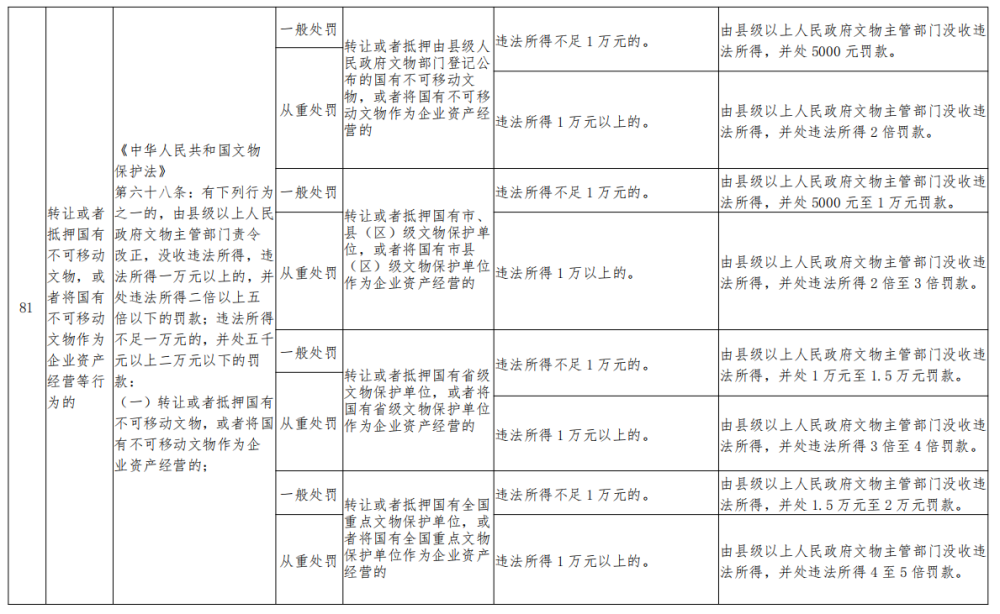 | 一级事项 | 行政处罚 | 二级事项 | 对将国有不可移动文物作为企业资产经营的行为进行处罚 |