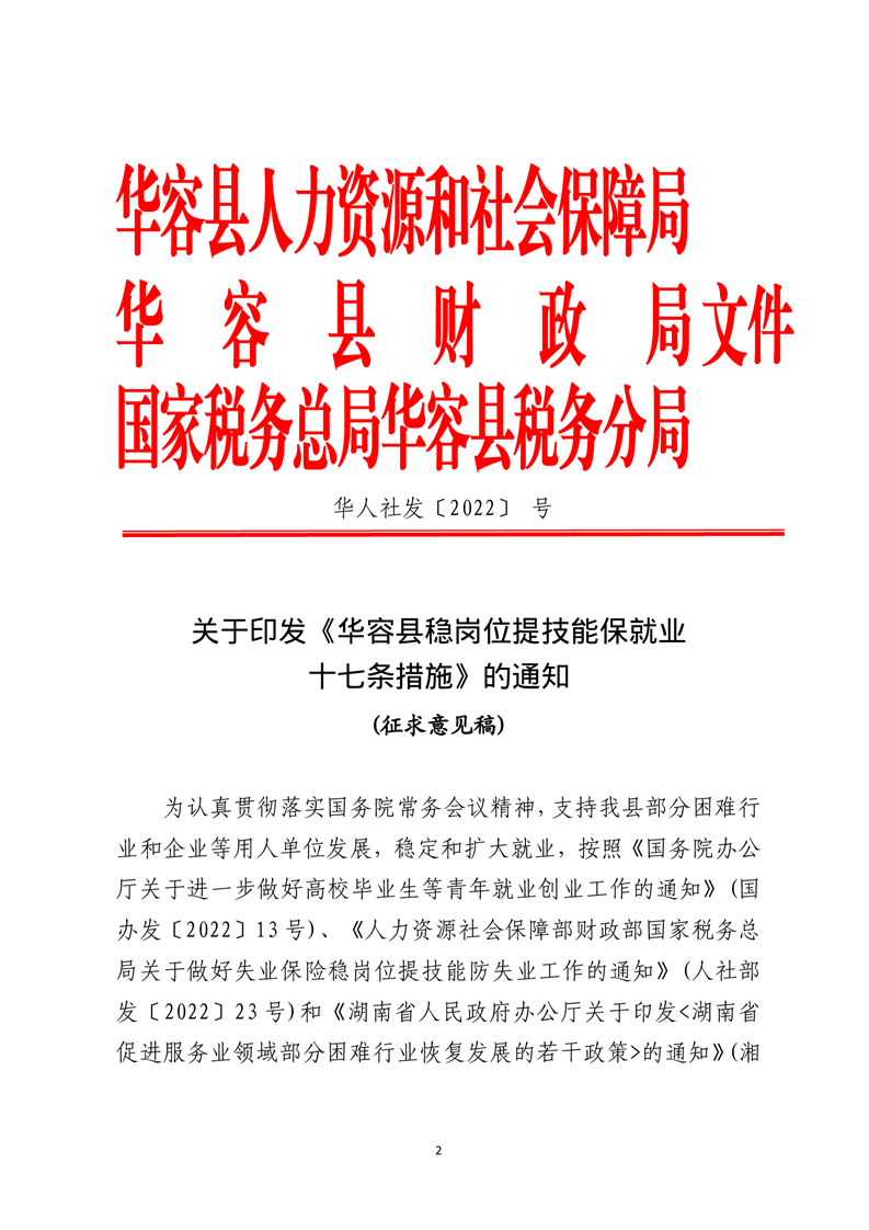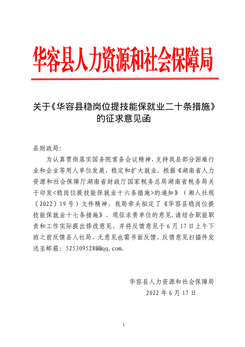 关于《华容县稳岗位提技能保就业二十条措施》的征求意见函