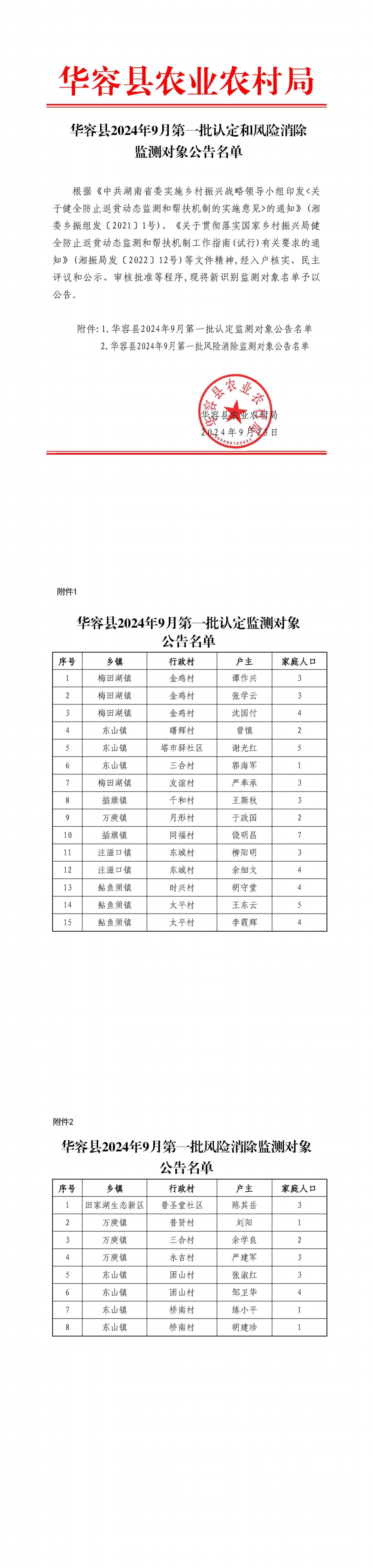 华容县2024年9月第一批认定和风险消除监测对象公告名单