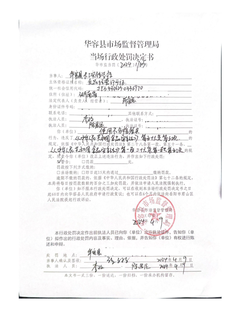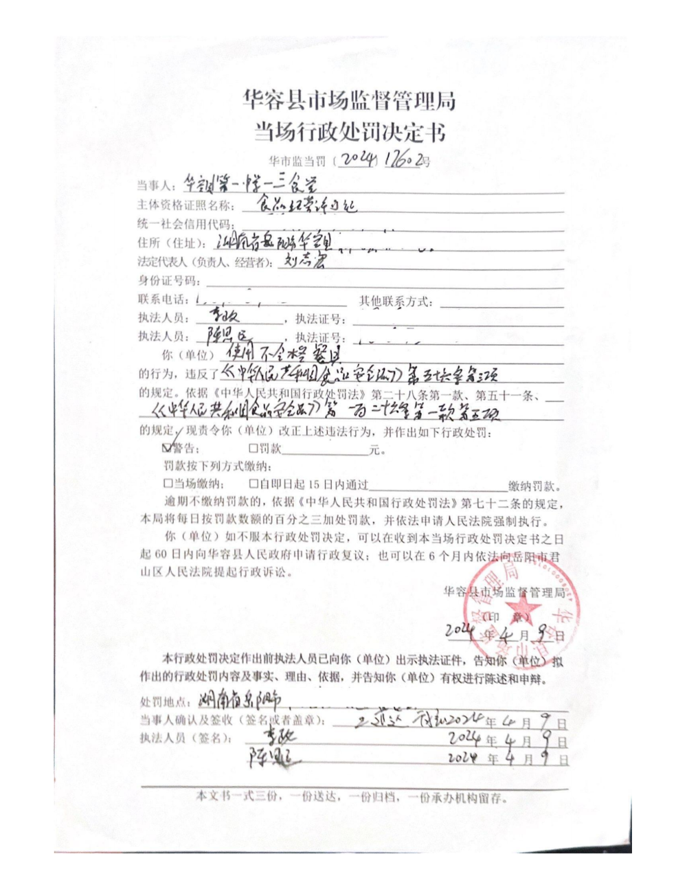 华容县市场监督管理局当场行政处罚决定书 华市监当罚〔2024〕17602号、华市监当罚〔2024〕17603号 对华容第一中学三食堂、华容县长工实验学校食堂使用不合格餐具的当场处罚决定