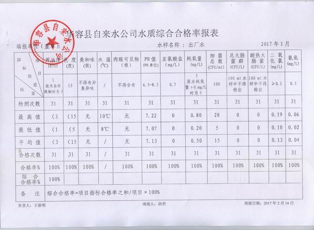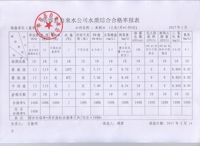 华容县自来水公司2017年01月水质报告单