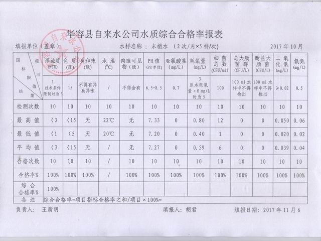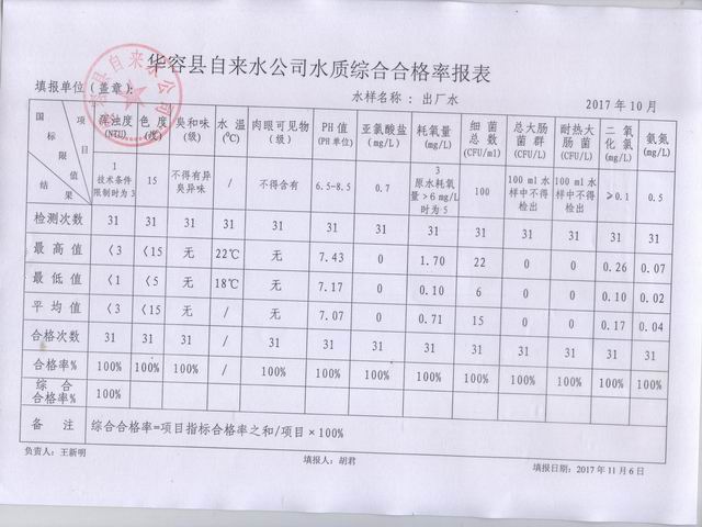 华容县自来水公司2017年10月水质报告单