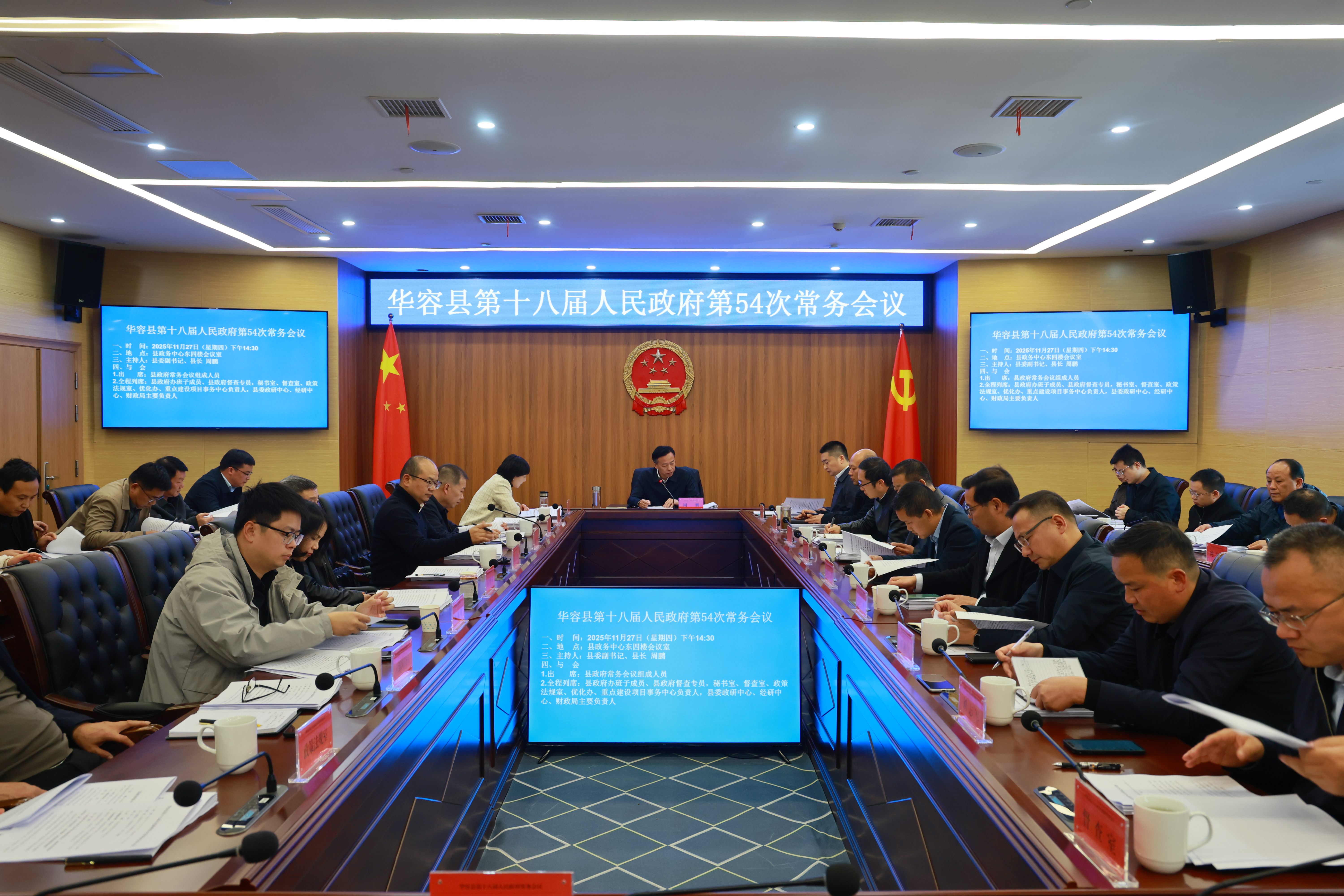 华容融媒体中心讯(记者刘神尊 周佳欢)11月27日,华容县委副书记、县长周鹏主持召开县政府第54次常务会议,传达学习习近平总书记近期重要讲话精神和上级有关会议、文件精神,研究贯彻落实意见,部署当前重点工作。县政府常务会议组成人员参加。