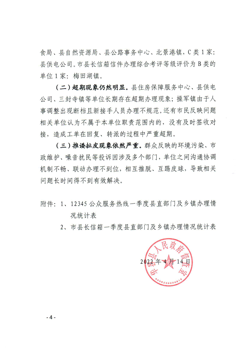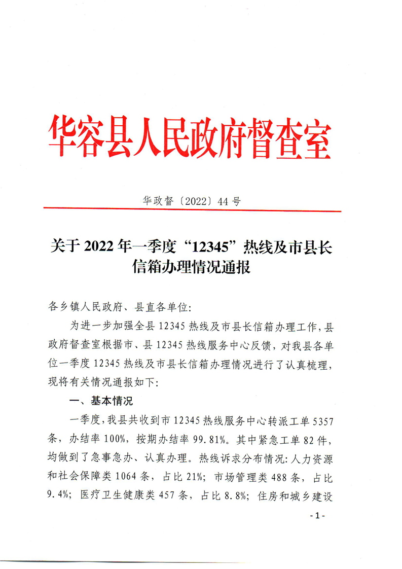 关于2022年一季度“12345”热线及市县长信箱办理情况通报