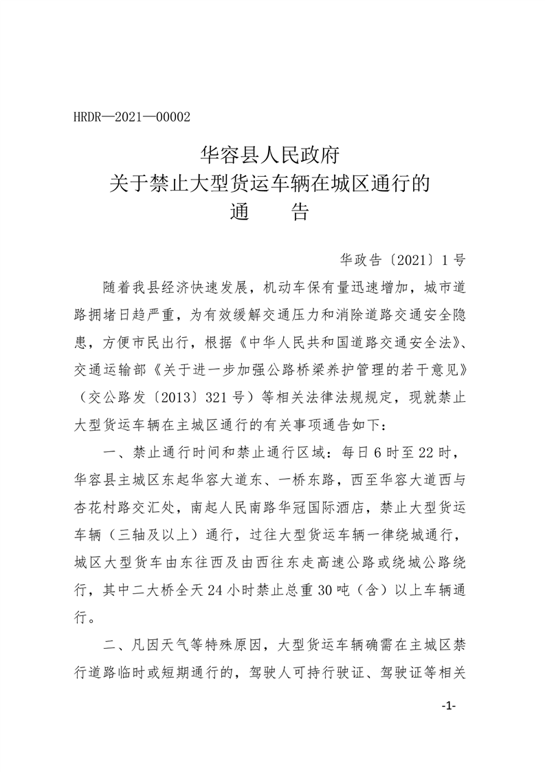 华容县人民政府关于禁止大型货运车辆在城区通行的通告