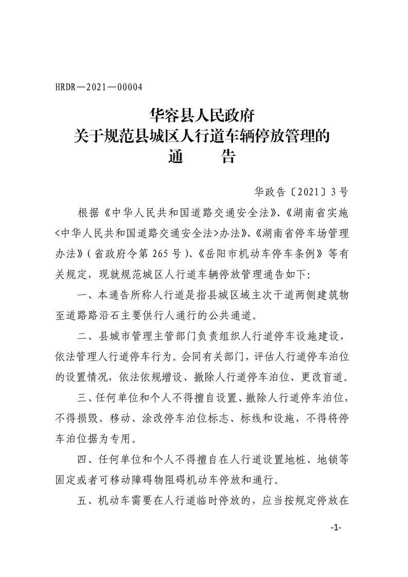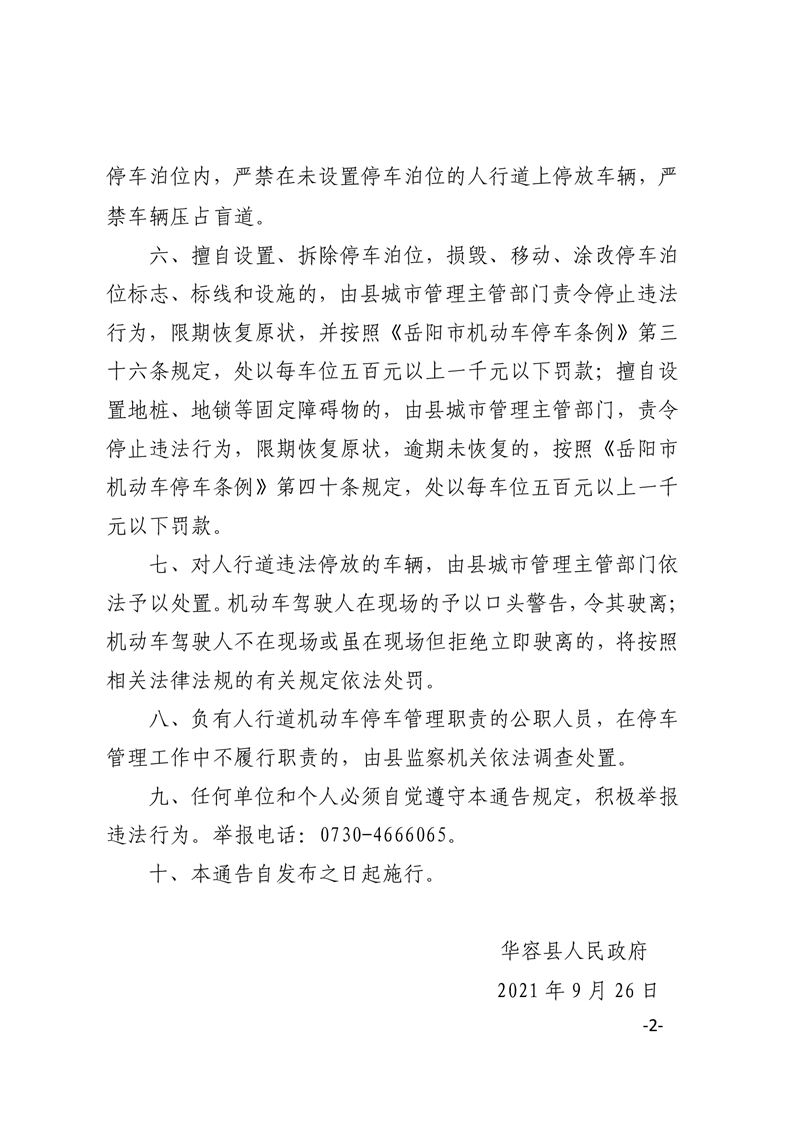华容县人民政府关于规范县城区人行道车辆停放管理的通告