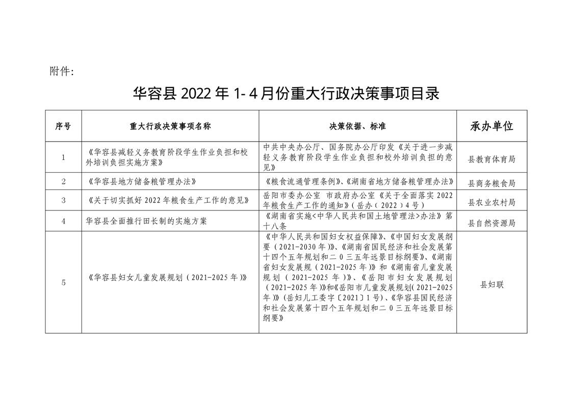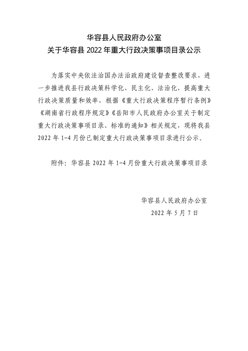 华容县人民政府办公室关于华容县2022年重大行政决策事项目录公示