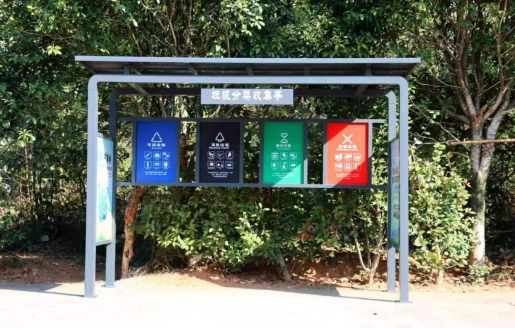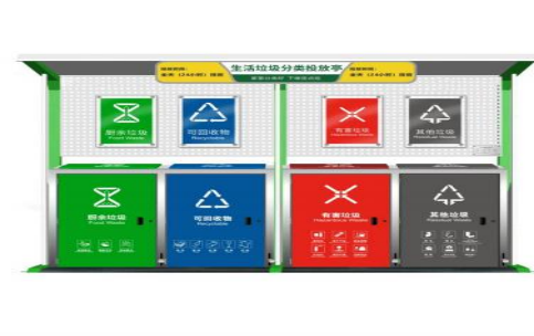 生活垃圾四分类亭由雨棚、背板、立柱、收集桶和宣传牌组成,其中收集桶分为四类:可回收物收集箱、厨余垃圾收集箱、有害垃圾收集箱和其他垃圾收集箱。整体效果如下: