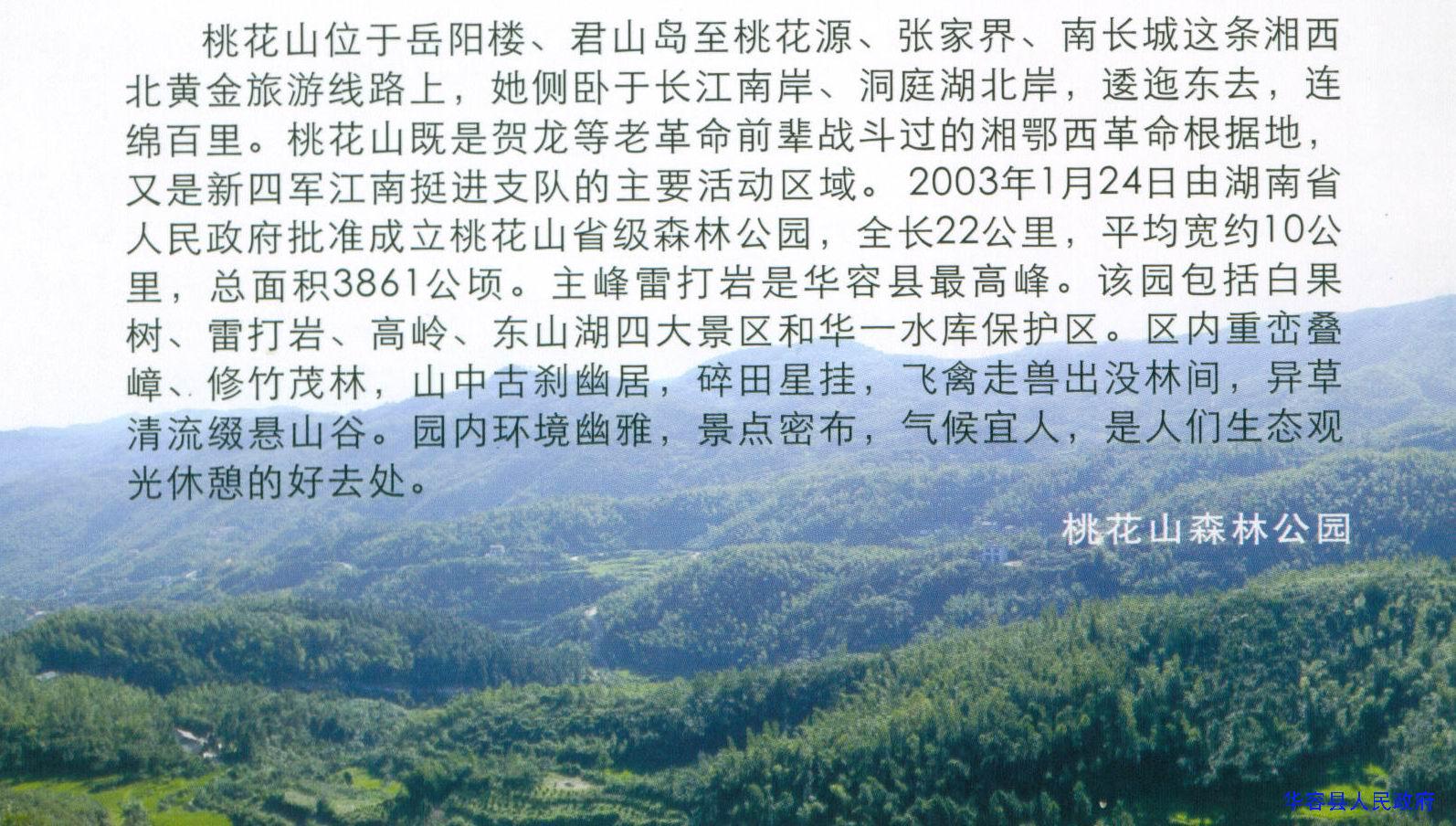 桃花山位于岳阳楼、君山岛至桃花源、张家界、南长城这条湘西北黄金旅游线路上,她侧卧于长江南岸、洞庭湖北岸,逶迤东去,连绵百里。桃花山既是贺龙等老革命前辈战斗过的湘鄂西革命根据地,又是新四军江南挺进支队的主要活动区域。
