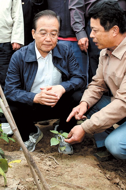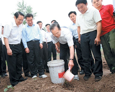 在村民的棉苗地里,温家宝总理舀起一勺水,缓缓注入棉苗地。