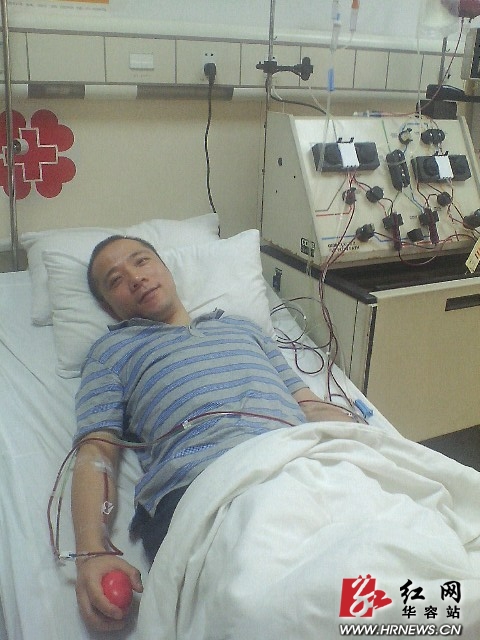 7月23日下午1:00,华容县人民医院检验科主任游其勇躺在中南大学湘雅医院血液科的病床上,开始接受6个小时的采集造血干细胞过程,为甘肃一位白血病患者无偿捐献造血干细胞。湘雅医院血液科医护人员介绍称,游其勇捐献的200毫升宝贵造血干细胞,明天上午将空运到甘肃输入患者体内,为患者点燃重生的希望。