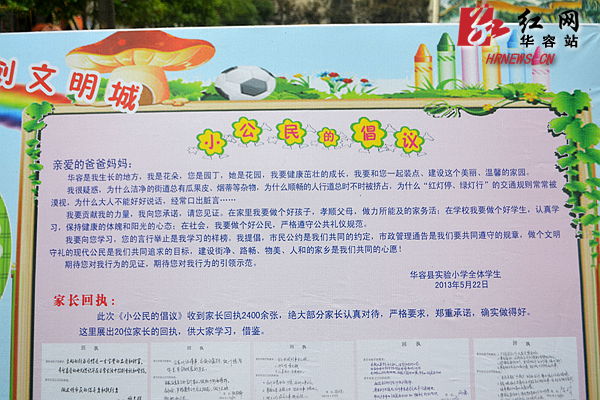 为加强文明知识宣传力度,华容县实验小学制作了《小公民的倡议》学习展板,并印发2400余份,由孩子们带回家,实现家校互倡文明